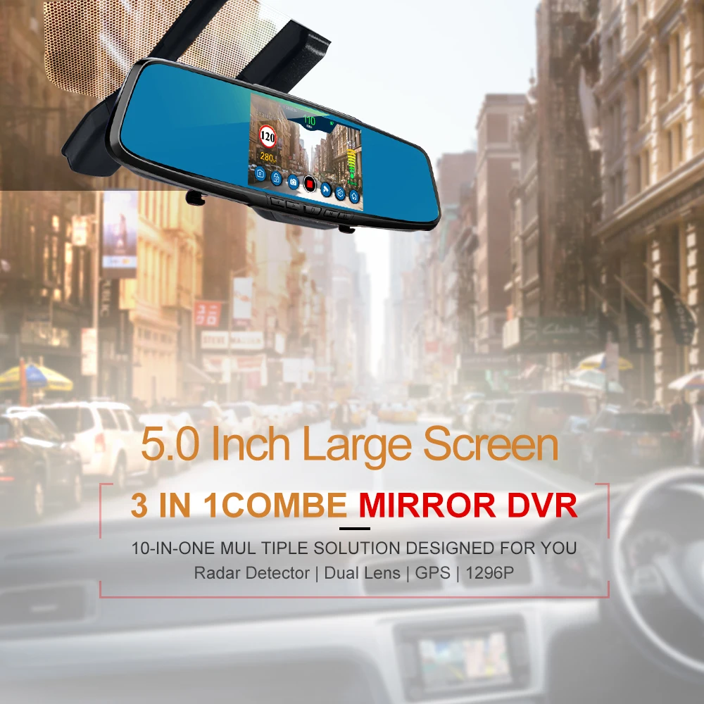 Product Name: Ruccess 5,0 "Автомобильные видеорегистраторы 3 в 1 зеркало заднего вида полицейский радар детектор с font b GPS b font FHD 1080p Dashcam двойной объектив Автомобильная ...